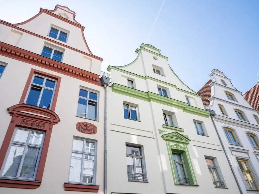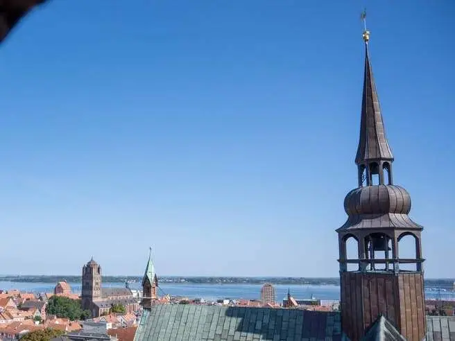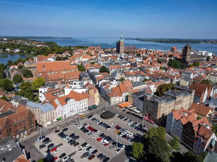 3. ตลาดใหม่ โบสถ์ St. Nicholas และโบสถ์ St. James มีทิวทัศน์มุมกว้างของเกาะ Rügen ด้านหลัง Strathson