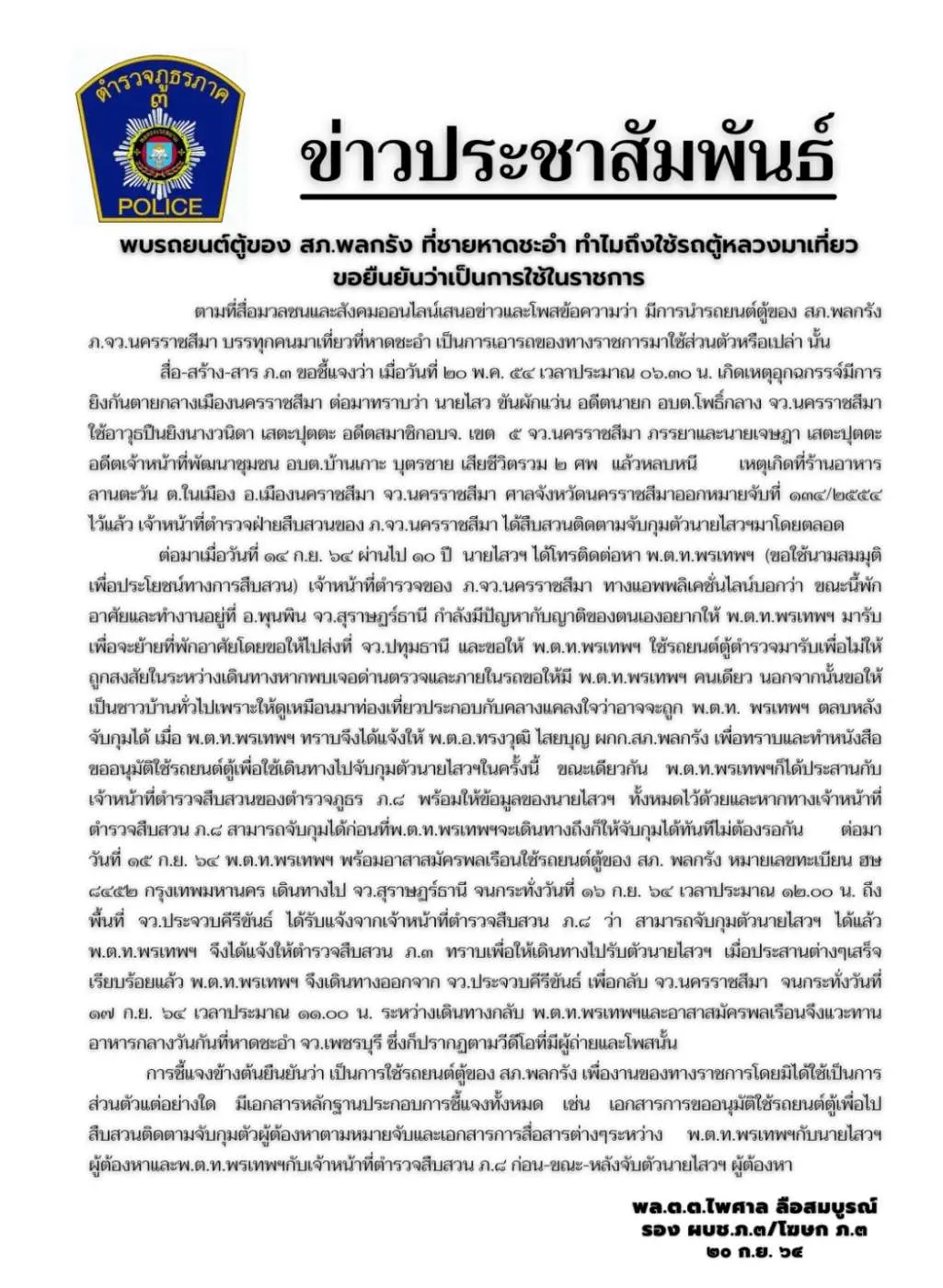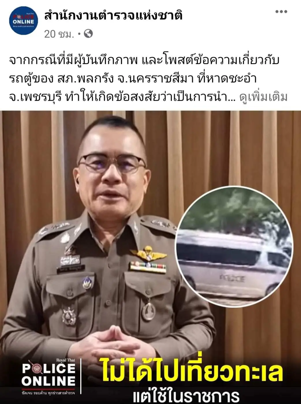 จากกรณีที่มีผู้บันทึกภาพ และโพสต์ข้อความเกี่ยวกับรถตู้ของ สภ.พลกรัง จ.นครราชสีมา
