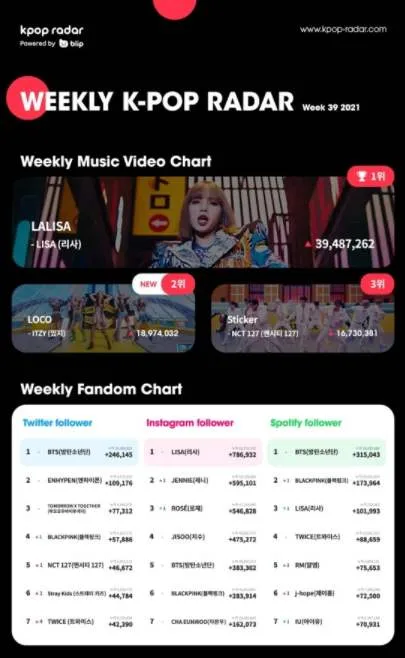 ลิซ่า Blackpink กลายเป็นศิลปินเดี่ยว K-pop คนแรกที่ติดอันดับชาร์ต K-Pop Radar Weekly Chart เป็นเวลา 3 สัปดาห์ติดต่อกัน