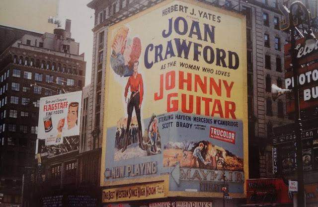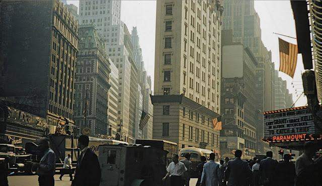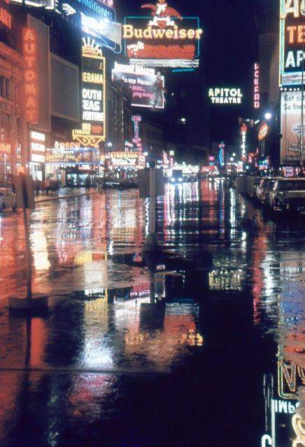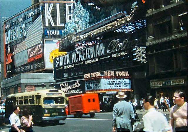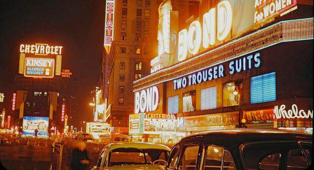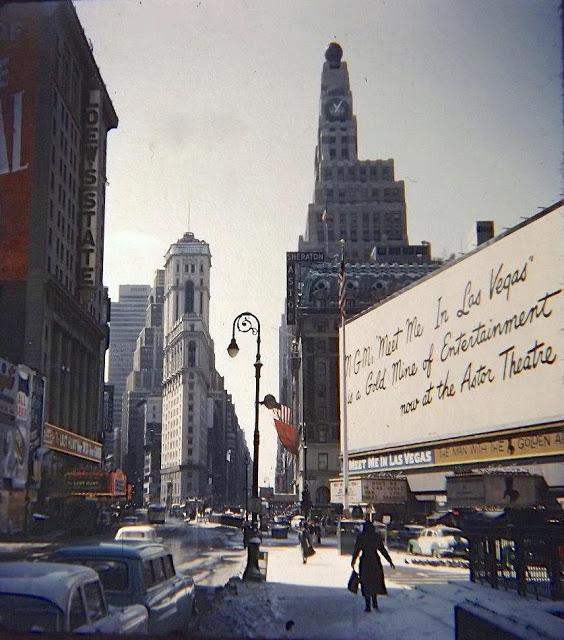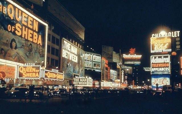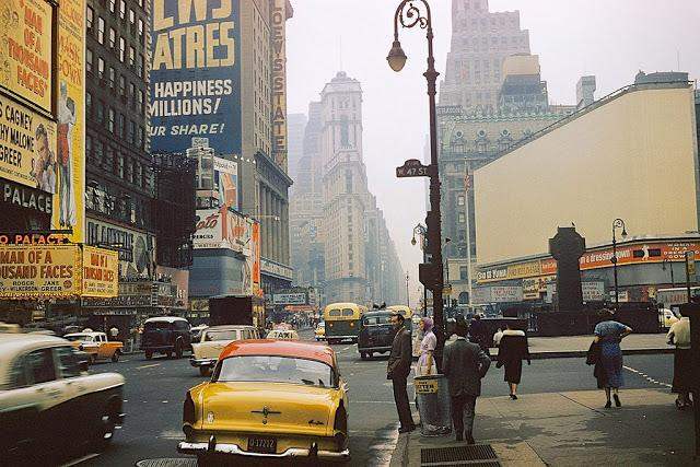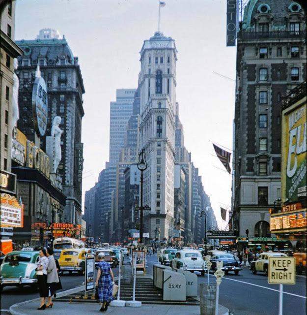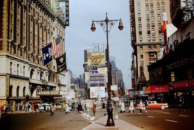 ภาพถ่ายของไทม์สแควร์ในนิวยอร์กในปี 1950 ถนนที่คึกคักที่ทางแยก