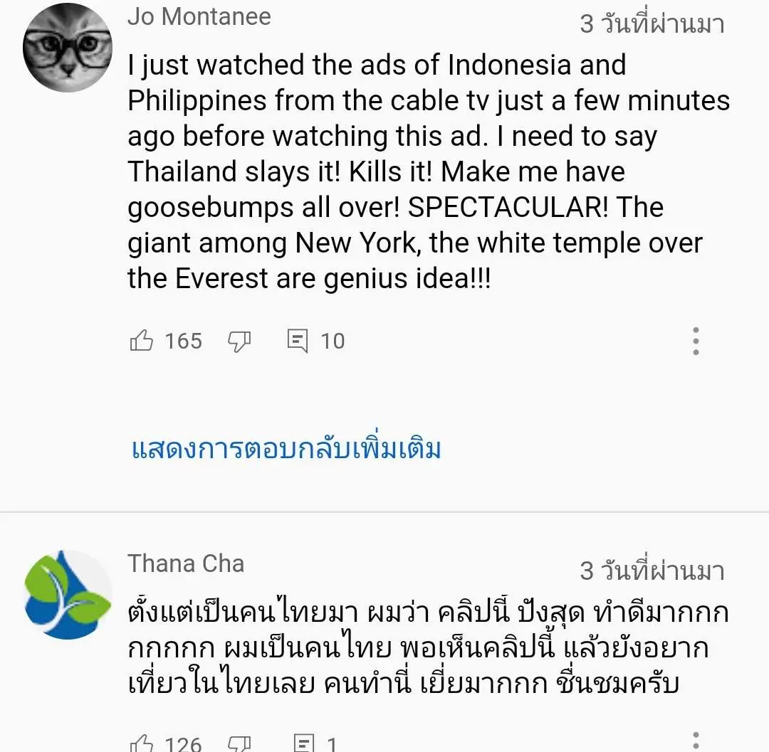 ได้สร้างความฮือฮาสำหรับชาวต่างชาติที่เป็นเป้าหมายของการโฆษณาเชิญชวนใหม่มาเที่ยวประเทศไทย รวมถึงชาวไทยที่ได้รับชม โดยส่วนหนึ่งของชาวต่างชาติได้โพสต์คอมเมนต์ชื่นชมโฆษณาตัวนี้ไว้ เช่น