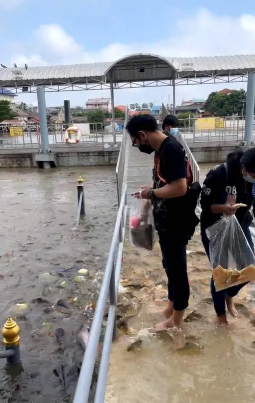 ระดับน้ำสูงมาก ประชาชนสามารถให้อาหารปลาบนโป๊ะได้เลย #น้ำท่วมอยุธยา