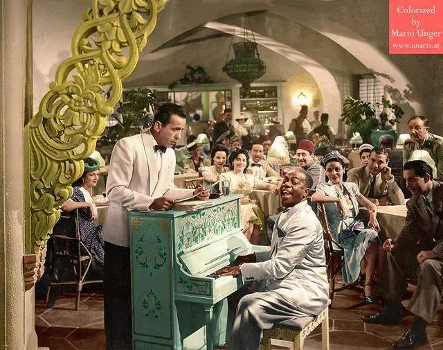 ภาพนิ่งจากภาพยนตร์เรื่อง 'Casablanca' ในปี 1942 ภาพยนตร์เรื่องนี้เล่าถึงเรื่องราวของนักธุรกิจ Rick ที่ถือตั๋วอันมีค่าในช่วงสงครามโลกครั้งที่ 2 การมาถึงของ Victor ผู้ต่อต้านนาซีและ Ilsa ภรรยาของเขาได้นำความสัมพันธ์เก่าระหว่าง Rick และ Ilsa กลับมา ต้องเผชิญกับความขัดแย้งทางอารมณ์และการเมือง