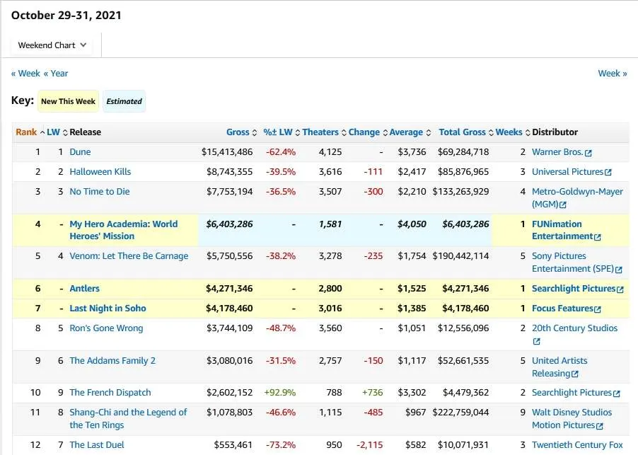 ส่วนอีก 4 อันดับที่เหลือในท็อปไฟว์ 1-2-3 เกาะอันดับเดิมเหนียวแน่น ดูน รายได้ลดกว่า 60% จากสัปดาห์ก่อนแต่ก็ยังไม่มากพอที่จะเสียแชมป์ ส่วนฮาโลวีนสังหารและพยัคฆ์ร้ายฝ่าเวลามรณะ ก็ยึดอันดับรองทั้งสองได้ด้วยเงินที่ลดลงมาเพียง 30% กว่าเท่านั้น และอันดับที่ 5 เวน่อม 2 ที่อยู่ในท็อปไฟว์มาเป็นสัปดาห์ที่ 5 ก็ลดลงประมาณกันแต่ได้เปิดทางให้มายฮีโร่แทรกเป็นอันดับ 4