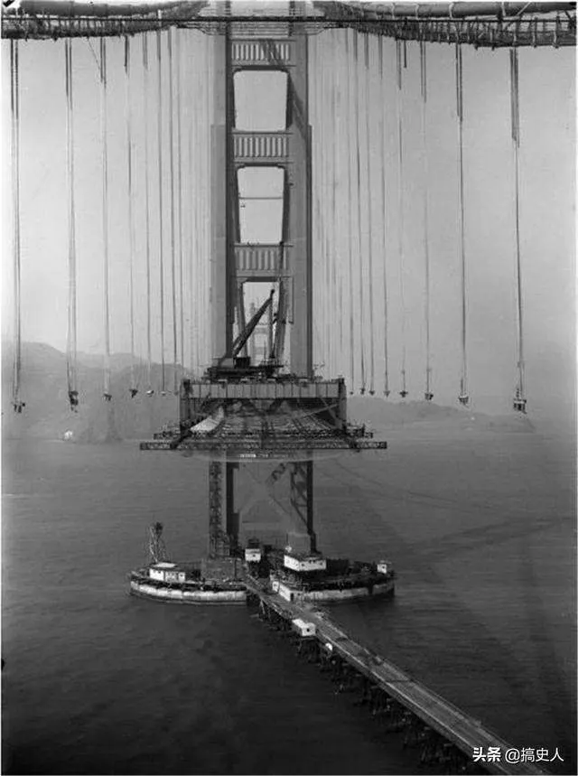 สะพานโกลเดนเกตอยู่ระหว่างการก่อสร้างในช่วงทศวรรษที่ 1930 สะพานโกลเดนเกตเป็นหนึ่งในอาคารสะพานที่มีชื่อเสียงของโลก เปิดให้สัญจรได้ในปี 1938