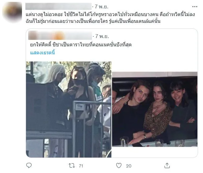 -แต่นางดูไม่อวดอะ ใช้ชีวิตไม่ได้โก้หรูหราอวดไปทั่วเหมือนบางคน คือถ้าทวิตนี้ไม่ลงฉันก็ไม่รู้มาก่อนเลยว่านางเป็นเพื่อกะใคร รู้แค่เป็นเพื่อนเตนล์แค่นั้น