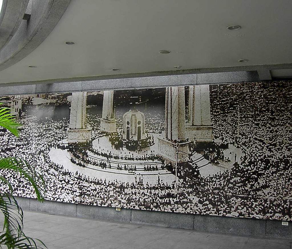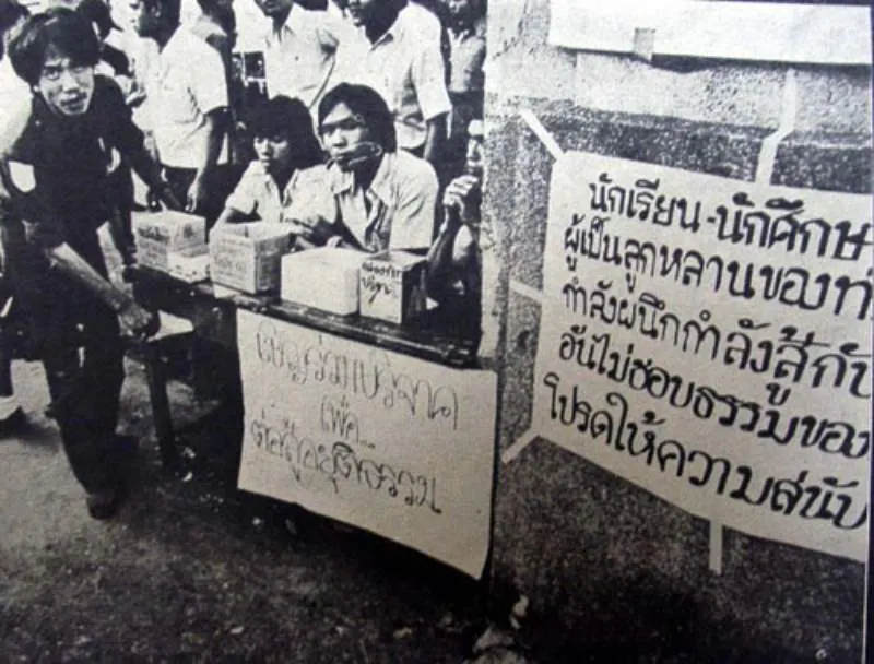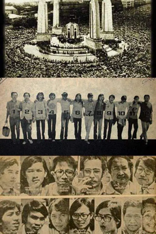 ฝูงชนชุมนุมที่อนุสาวรีย์ประชาธิปไตยในปี 2516 เพื่อต่อต้านระบอบเผด็จการทหาร (จัดแสดงที่อนุสรณ์สถาน 14 ตุลาคม 2516 กรุงเทพฯ)