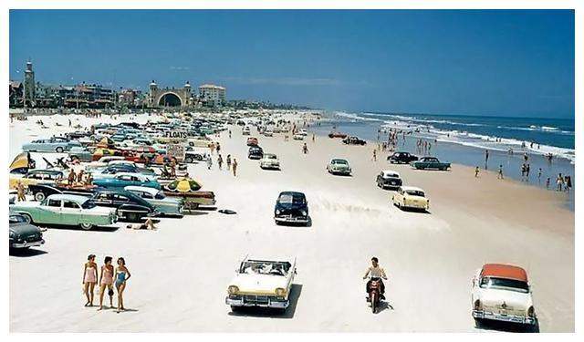 ภาพที่ 1: หาดเดย์โทนา สหรัฐอเมริกา ปี 1957 โดยมีรถยนต์จอดอยู่บนชายหาดหลายคัน