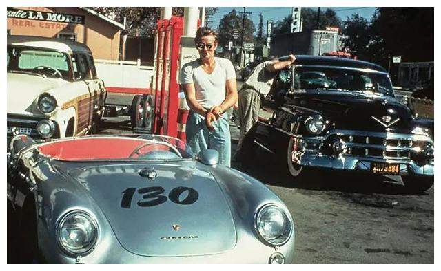 รูปที่ 5: รถปอร์เช่สีเงินจอดอยู่ที่ปั๊มน้ำมันในแคลิฟอร์เนียในปี 1955