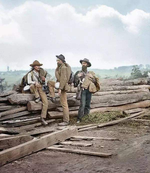 2. ในปี พ.ศ. 2406 เมืองเกตตีสเบิร์ก สหรัฐอเมริกา นักโทษรัฐบาลกลางสามคน ภาพถ่ายสี