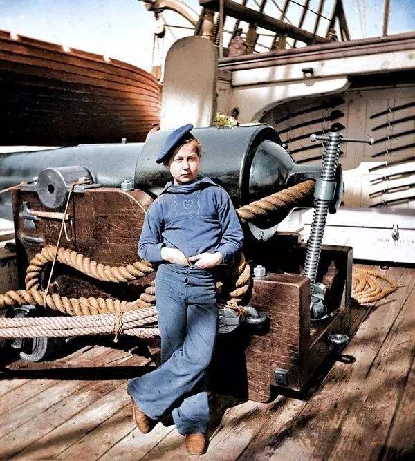 3. ในปี พ.ศ. 2408 ระหว่างสงครามกลางเมืองเหนือ-ใต้ เด็กชายและปืนใหญ่บนเรือในท่าเรือชาร์ลสตัน รัฐเซาท์แคโรไลนา ภาพถ่ายสี
