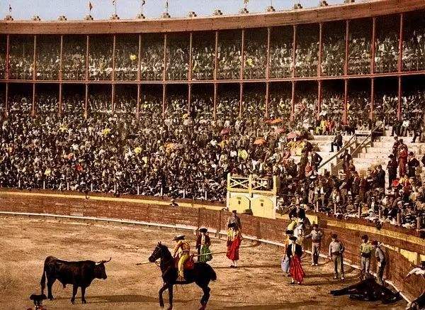 7. ในปี พ.ศ. 2438 บาร์เซโลนา ประเทศสเปน เหตุการณ์สู้วัวกระทิง ลงสีด้วยมือ.