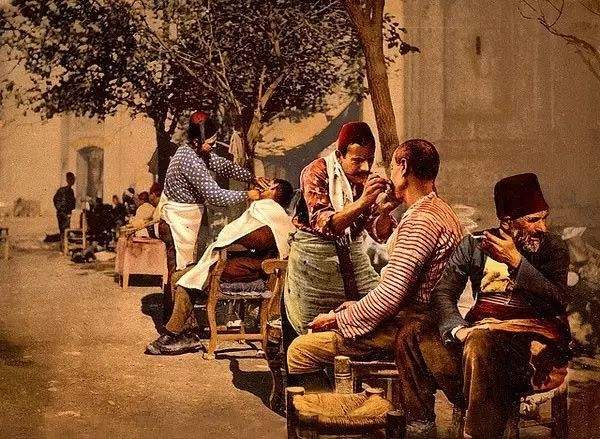 8. ในปี พ.ศ. 2438 อิสตันบูล ประเทศตุรกี พ่อค้าตัดผมและถอนฟันตามท้องถนน ลงสีด้วยมือ.