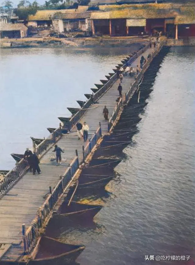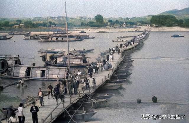 ในเมืองอี้ชุน มณฑลเจียงซี ในปี 2485 สะพานเรือนอกเมืองและแม่น้ำซิ่วเจียงคดเคี้ยวผ่านเมืองอี้ชุน และเรือต่างเรียงรายไปตามแม่น้ำ และวางสะพานเพื่อสร้างสะพานเรือสำหรับคนทั้งสองฝั่ง ของช่องแคบ