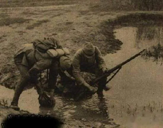 6. เมื่อวันที่ 4 กันยายน ใกล้ Tangguantun ทหารญี่ปุ่นสองคนล้างเลือดและสิ่งสกปรกออกจากหมวกและปืนด้วยน้ำฝน