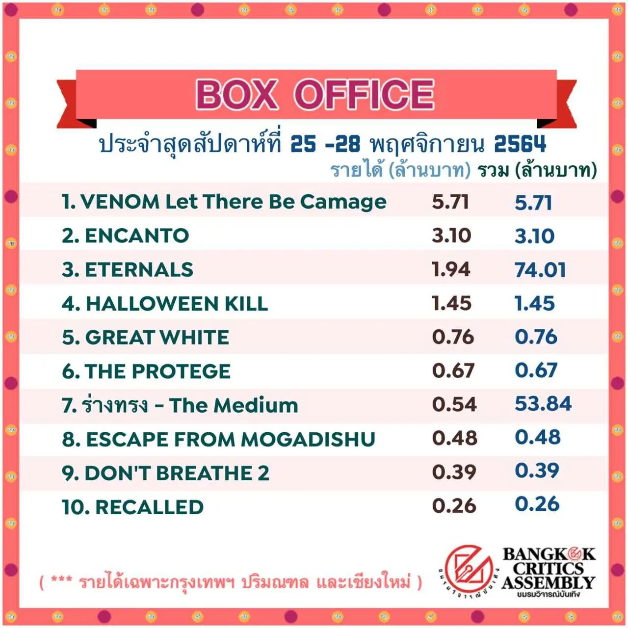 นอกจากหนังใหม่สองเรื่องนี้ หนังที่ทำเงินสูงสุดยังคงเป็นอีเทอร์นอล ETERNALS ฮีโร่พลังเทพเจ้าที่กวาดรายได้รวมทั้งประเทศไปแล้ว 108 ล้านบาท ภาพยนตร์ใหม่ที่ทำเงินรองลงมาได้แต่ ฮาโลวีนสังหาร ฉลามขาวเพชฌฆาต และ เธอ...รหัสสังหาร ส่วนหนังเกาหลีทั้งสองคือ หนีตายโมกาดิชู และ ระลึกหลอน ต่างก็แทบไม่ทำเงิน ในขณะที่หนังเก่า ร่างทรง กับ ลมหายใจสั่งตาย 2 ยังคงมีผู้ชมอยู่ในระดับที่ยังไม่ทำให้หลุดท็อปเท็น
