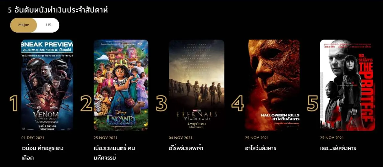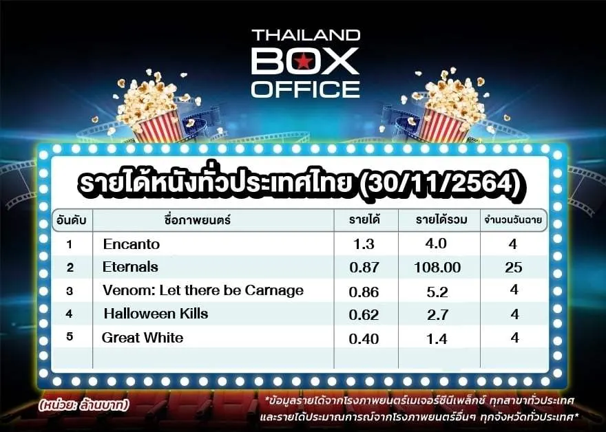 สุดสัปดาห์ที่ผ่านมาในประเทศไทย (พฤหัสบดี 25 - อาทิตย์ 28 พฤศจิกายน 2564) ภาพยนตร์เรื่องเวน่อม 2 ศึกอสูรแดงเดือด จัดฉายเฉพาะรอบพิเศษตั้งแต่ 1 ทุ่มของทุกวันเฉพาะบางสาขา แต่กลับทำรายได้สูงสุดเป็นอันดับ 1 ในเครือเมเจอร์ ทั่วกรุงเทพฯ ปริมณฑล และเชียงใหม่ นี่เป็นครั้งแรกที่หนังรอบพิเศษมีรายได้เหนือรอบปกติประจำสุดสัปดาห์ในประเทศไทย แต่ถ้าวัดกันทั้งประเทศรวมประมาณการจากจังหวัดอื่นๆ ภาพยนตร์ใหม่ เมืองเวทมนตร์ คนมหัศจรรย์ การ์ตูนแอนิเมชั่นแนวลาตินมิวสิคอลจากดีสนีย์เป็นอันดับ 1 ด้วยรายได้ที่ต่ำมาก