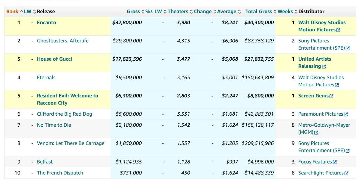 ที่อเมริกา เอ็นกันโต้ หรือเมืองเวทมนตร์ ขึ้นอันดับ 1 เช่นกัน สัปดาห์นี้เป็นสัปดาห์ขอบคุณพระเจ้าซึ่งเหมือนจะได้รับการผูกขาดจากหนังแอนิเมชั่นการ์ตูนดีสนีย์ว่าจะต้องเป็นอันดับ 1 แต่ปีนี้ทำได้แค่ 40 ล้านทั้งที่ยังไม่เข้าในดีสนีย์พลัสถือว่าต่ำกว่าเป้าหมายที่คาดการณ์ไว้มาก ในขณะที่อันดับ 2 บริษัทกำจัดผี ลงจากสัปดาห์ที่แล้ว แต่เหมือนไม่ยอมลดรายได้ ยังกวาดไปอีกราว 30 ล้านทำให้ยอดรวมเกือบ 90 ล้าน อันดับ 3 หนังใหม่ริดลี่ สก็อต หลังจากเจ็บช้ำจากหนังฟอร์มยักษ์ The Last Dual ไม่กี่เดือนก่อน กู้หน้าได้สำเร็จจากหนังแฟชั่น House of Gucci นำแสดงโดยเลดี้ กาก้า และ อดัม ไดรฟ์เวอร์ ส่วนหนังสร้างใหม่คาดหวังสูงอีกเรื่อง Resident Evil: Welcome To Raccoon City เป็นอันผิดหวัง เปิดตัวได้ไม่ถึงสิบล้าน แพ้แม้กระทั่งหนังเก่า 4 สัปดาห์อย่างอีเทอร์นอล