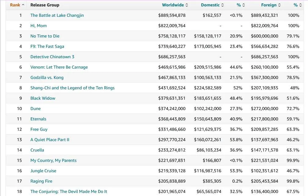 อัพเดทรายได้หนังทั่วโลก ขณะนี้ The Battle At Lake Changjin นอกจากจะเป็นที่ 1 ของโลกในยุคโควิดแล้ว ยังล้มสถิติ Wolf Worrier จนกลายเป็นหนังทำเงินสูงสุดตลอดกาลที่จีนแผ่นดินใหญ่ได้สำเร็จ เจมส์บอนด์ 25 หลังจากชนะฟาสท์ 9 แล้ว ยังเดินหน้าใกล้เข้าสู่ 800 ล้านเป็นเรื่องแรกของหนังฮอลลีวูดในยุคโควิดหรือของทั้งสองปีนี้ และเวน่อม 2 นอกจากเป็นหนังมาร์เวลโซนี่ที่เหนือกว่ามาร์เวลดีสนีย์ทั้งสามเรื่องในรอบสองปีนี้แล้ว ยังมีลุ้นว่าจะทำเงินทะลุ 500 ล้าน $ ด้วยเนื่องจากขณะนี้ยังฉายจริงไม่ครบทุกประเทศ