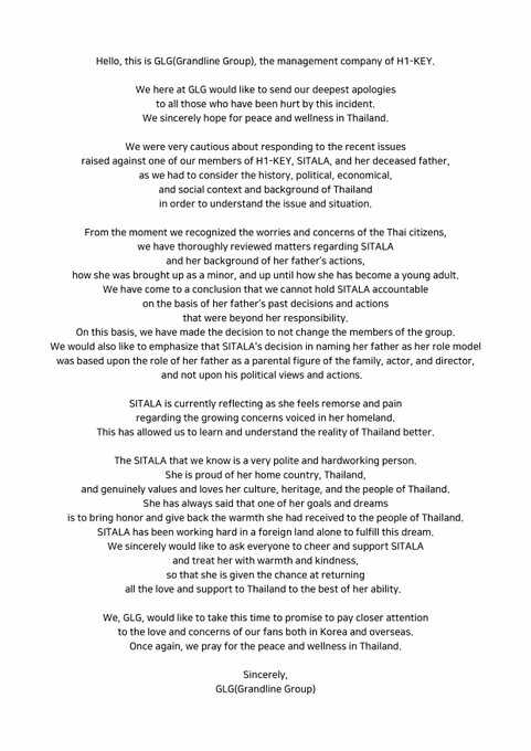H1KEY เอเจนซี่ของ ศีตลา (Sitala) บอกว่าศีตลา สมาชิกชาวไทยจะยังคงอยู่ในกลุ่มแม้จะมีกระแสต่อต้าน