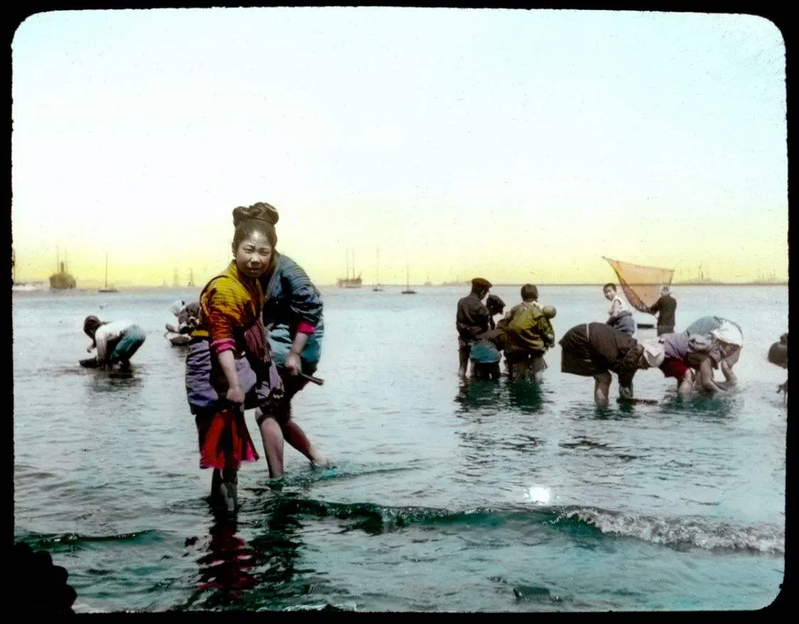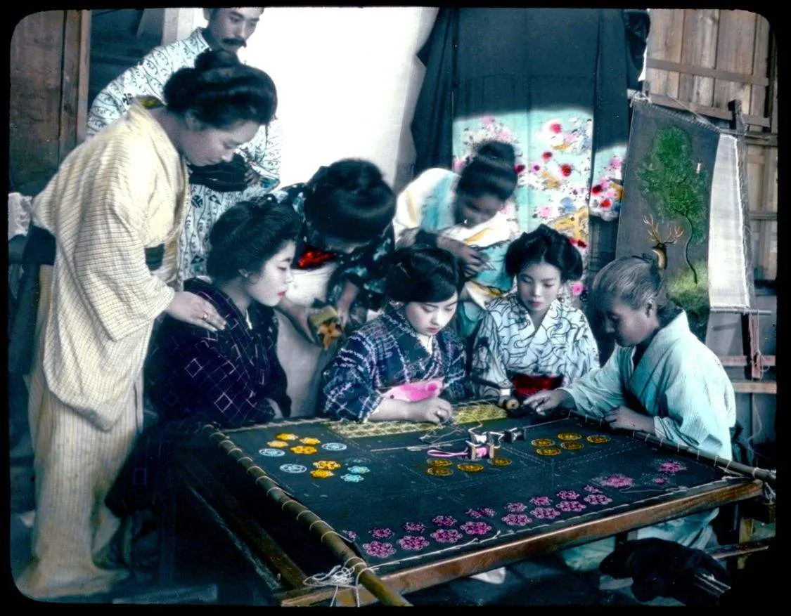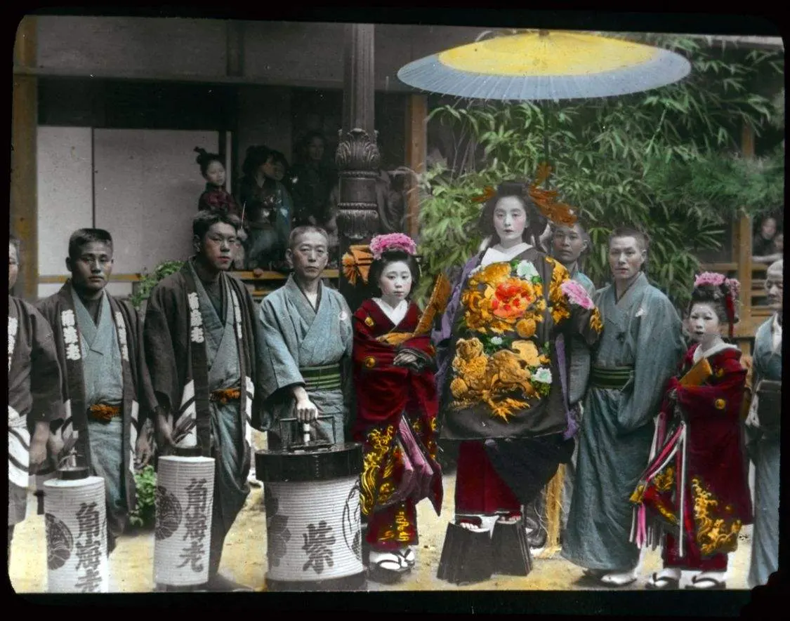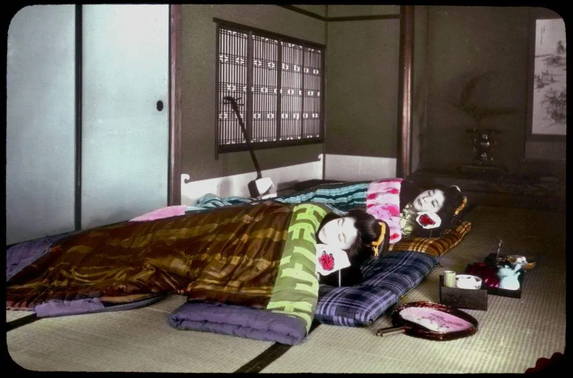 ในช่วงปี 1910 เกอิชาในโยชิฮาระ ย่านโคมแดงของโตเกียว ถ่ายรูปกับพี่เลี้ยงของเธอ ภาพถ่ายโดย Herbert Geddes