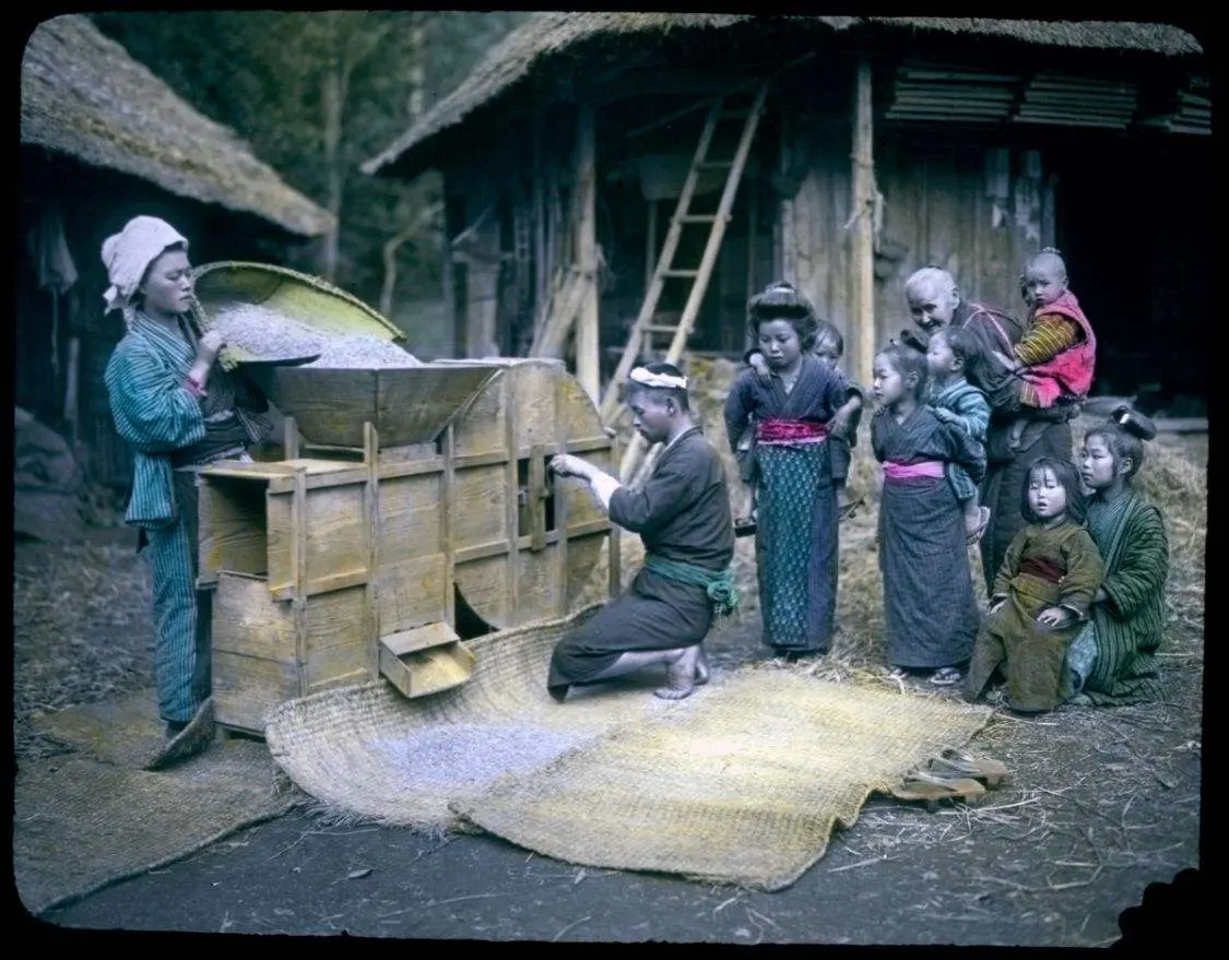 ชาวนาที่กำลังตำข้าวดูตื่นเต้น