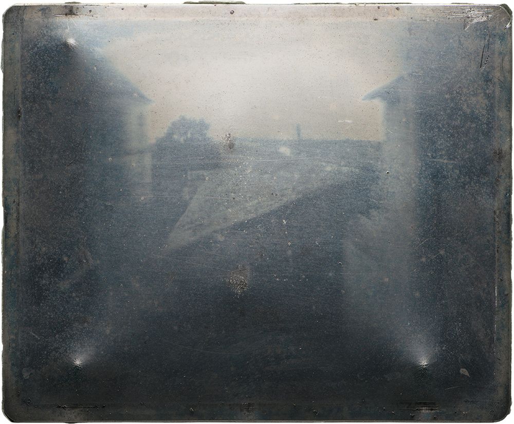 ดูเหมือนไม่มาก แต่นี่เป็นภาพถ่ายแรกของโลก หรือมากกว่า ภาพถ่ายที่เก่าแก่ที่สุดที่ยังหลงเหลืออยู่ หรือทั้งสองอย่าง ภาพนี้ถูกถ่ายโดยนักประดิษฐ์ชาวฝรั่งเศส Nicéphore Niépce โดยใช้กล้อง obscura โฟกัสไปที่แผ่นดีบุกผสมตะกั่วที่เคลือบด้วยชั้นบางๆ ของ Bitumen of Judea ซึ่งเป็นแอสฟัลต์ที่เกิดขึ้นเองตามธรรมชาติ Niépce เปิดเผยจานนี้ผ่านเลนส์ไปยังอาคารและชนบทโดยรอบของที่ดิน Le Gras ใน Saint-Loup-de-Varennes เชื่อกันว่าการเปิดรับแสงนั้นกินเวลาอย่างน้อยแปดชั่วโมง นานถึงหลายวัน