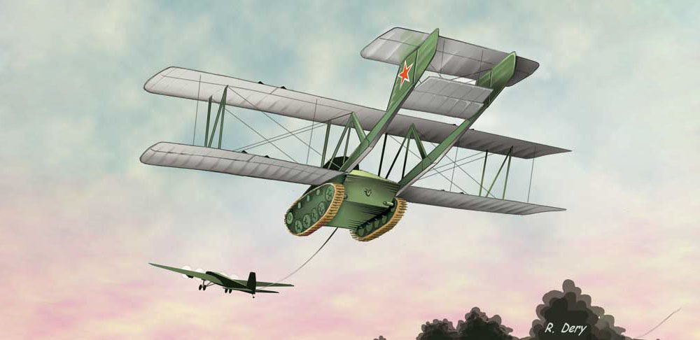 แนวคิดที่คล้ายกันกำลังถูกสำรวจโดยประเทศอื่น ๆ ในโซเวียตรัสเซีย มีความพยายามครั้งแรกในการทิ้ง “แอร์บัส” ที่เต็มไปด้วยทหารและยานพาหนะสะเทินน้ำสะเทินบกลงไปในน้ำ รถโดยสารพังทลายเมื่อลงจอด แต่ลูกเรือรอดชีวิตมาได้ ดังนั้นแนวคิดนี้จึงถูกยกเลิก ต่อไปพวกเขาลองรัดรถถังน้ำหนักเบาเช่น T-37 และ T-27 ไว้ด้านล่างของเครื่องบินทิ้งระเบิดหนัก ระหว่างการยึดครองเบสซาราเบียในปี 1940 รัสเซียพยายามทิ้งรถถังจากเครื่องบินทิ้งระเบิดในขณะที่บินขึ้นไปเพียงไม่กี่เมตร แต่การซ้อมรบนั้นอันตรายและความเสี่ยงที่จะถูกยิงด้วยเครื่องบินทิ้งระเบิดนั้นสูง