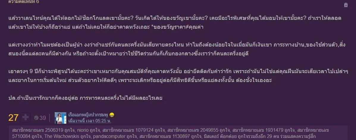 แล้ววาเลนไทน์คุณได้ให้ดอกไม้/ช็อกโกแลตเขามั้ยคะ? วันเกิดได้ให้ของขวัญเขามั้ยคะ? เคยมีอะไรพิเศษที่คุณได้มอบให้เขามั้ยคะ? ถ้าเราให้ตลอดแล้วเขาไม่ให้บ้างก็ถือว่าแย่ แต่ถ้าไม่เคยให้ก็อย่าคาดหวังเถอะ *ของขวัญราคา≠คุณค่า