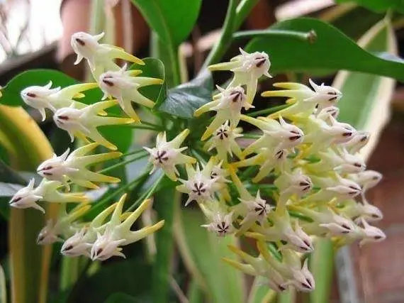 🐲🐉🌿ต้างไม้พันงูเป็นไม้ประดับในไทยไม้เลื้อยกึ่งพุ่มดอกสีขาวครีมออกเป็นช่อตก้านช่อยาว 2.5-3 ซม. ดอกย่อยมีกลีบดอก 5 กลีบเมื่อบานกลีบดอกจะกลับลงล่างมีรยางค์ปลายแหลมงอน 5 อันผิวมันเป็นเงาในประเทศไทยพบในป่าดิบชื้นตามคาคบไม้หรือซอกหินใกล้ริมลำธารออกดอกติดผล ออกผลช่วงกรกฎาคม-พฤศจิกายน