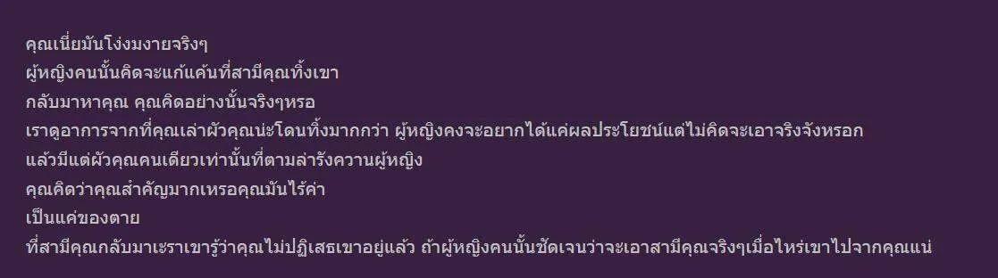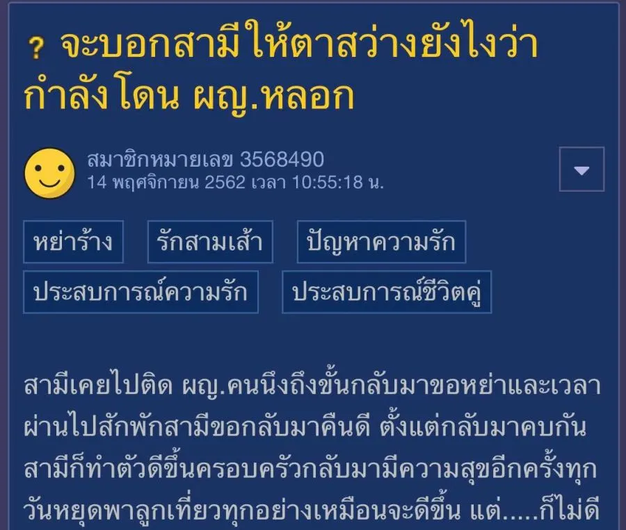 สามีเคยไปติด ผญ.คนนึงถึงขั้นกลับมาขอหย่าและเวลาผ่านไปสักพักสามีขอกลับมาคืนดี ตั้งแต่กลับมาคบกันสามีก็ทำตัวดีขึ้นครอบครัวกลับมามีความสุขอีกครั้งทุกวันหยุดพาลูกเที่ยวทุกอย่างเหมือนจะดีขึ้น แต่.....ก็ไม่ดีเราแอบดูมือถือสามี สามียังติดต่อกับ ผญ.คนนั้น ยังขอไปหา ผญ.คนนั้น พอเห็นว่า ผญ.คนนั้นคุยกับคนใหม่ สามีเกิดหัวร้อนโทรหา ผญ.คนนั้นตั้งแต่หกโมงเย็นถึง ตี2 โดยที่ ผญ.คนนั้นไม่รับสาย พอวันรุ่งขึ้นหลอกเราว่ามีงานต่างจังหวัดแต่จริงๆคือไปแอบดักรอ ผญ.คนนั้น และที่ผ่านมายังแอบไปดักเจอ ผญ.คนนั้นเฉลี่ยสัปดาห์ละ 1ครั้ง ทักไปหา ผญ.คนนั้นทุกวัน และดูจากการทักแชทพุดคุย มีแต่สามีเราที่ทักไปเหน็บ ผญ.คนนั้นเรื่อง ผญ.คนนั้นจะมีคนใหม่ ส่วนผญ.คนนั้นหรอคะไม่ได้สนใจคำพูดสามีเราเลย ออกแนวจะปั่นหัวสามีเรากลับด้วยซ้ำ ส่วนสามีเราหรอคะ ผญ.คนนั้นเอ่ยปากอยากได้อะไรประเคนให้ ผญ.คนนั้นหมด ล่าสุดหน้าจะโอนเงินให้ 5หมื่น(โอนให้ทั้งๆที่ช่วงนี้สามีเราสภาพคล่องทางการเงินก็ไม่ได้ดี) ที่เรารู้ว่าโอนให้เพราะเราเห็นสามีเราตัดเพ้อน้อยใจ ผญ.คนนั้นว่าพอได้เงิน ซื้อของให้แล้วหายไป ส่วนกับเราเขาก็ไม่ยอมเลิกทำตัวปกติทุกอย่างเลิกงานก็กลับบ้านปกติ ถ้าจะมีแอบไปดักเจอก็อย่างที่บอกสัปดาห์ละประมาน 1ครั้งไม่เกินนี้ค่ะ ทุกวันนี้ทุกข์ใจมากไม่รู้จะบอกสามียังไงว่า ผญ.คนนั้นไม่ได้รักสามี จากเซ้นท์เราเหมือน ผญ.คนนั้นต้องการแค่แก้แค้นที่สามีกลับมาหาเรา แต่สามีตัวดีเรานั้นแหละที่เอาไปประเคนให้เขาหมด ผญ.คนนั้นก็ไม่ยอมเลิกกับเราก็ไม่ยอมเลิก เราเคยให้สามีเลือก สามีก็เลือกที่จะอยู่กับเรา จนทุกวันนี้ไม่แน่ใจว่าที่เลือกเราเพราะกลับไปหา ผญ.คนนั้นไม่ได้หรือยังไง ส่วนผญ.คนนั้นหรอคะยิ่งรู้ว่าสามีเราเป็นแบบนี้ยิ่งเหมือนปั่นหัวสามีเรา ด่าสามีเราเสียๆหายๆด้วยซ้ำ แต่สามีเราก็ยังไม่ยอมเลิกกับนางสักที ไม่รู้ ผญ.คนนั้นมีอะไรดีถึงได้หลงขนาดนั้น T^T