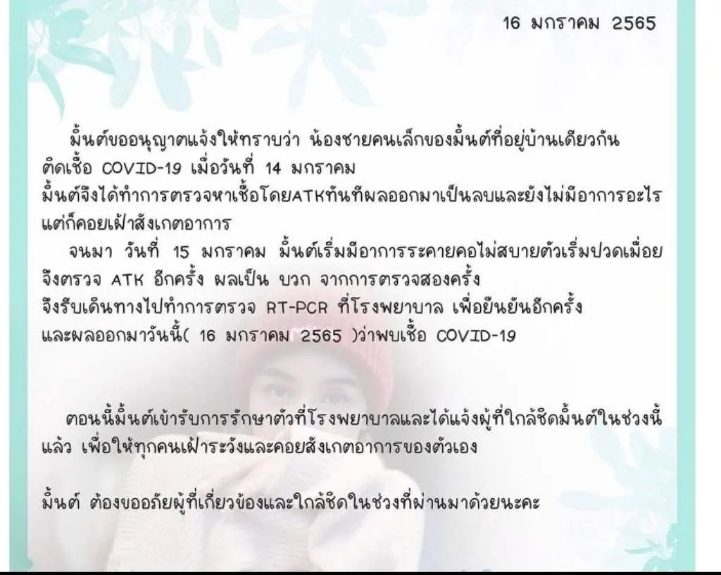 เมื่อวันที่ 16 ม.ค. 65 ดารานางเอกสาวมิ้นต์ ชาลิดา วิจิตรวงศ์ทอง โพสต์ข้อความแจ้งว่า ติดเชื้อโควิด-19