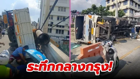 ระทึกกลางกรุง! รถ 6 ล้อบรรทุกเครนพลิกคว่ำหวิดตกคลอง น้ำมันรั่วเกลื่อนถนน บาดเจ็บ 2 ราย