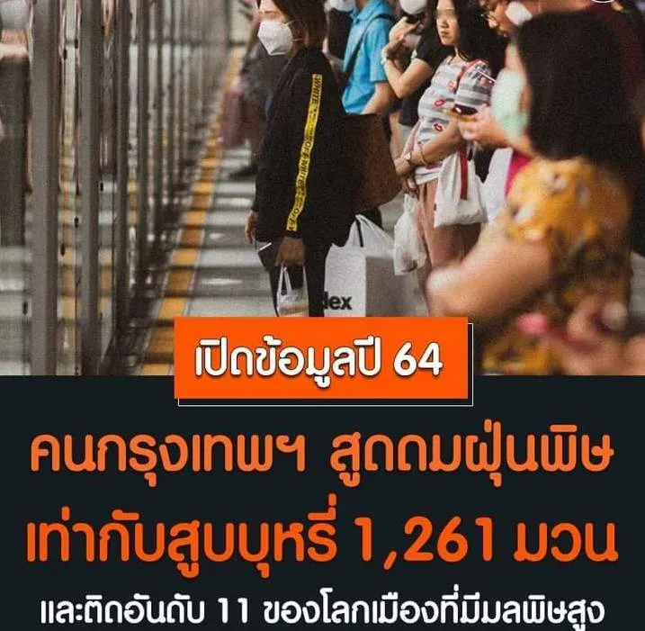 สูดดมฝุ่นพิษ PM 2.5 อันตรายเหมือนกับสูบบุหรี่ไปกว่า 1,261 มวน (ค่าฝุ่น PM 2.5 จำนวน 22 ไมโครกรัม/ลูกบาศก์เมตร=สูบบุหรี่ 1 มวน) ซึ่งคนกรุงเทพฯ อยู่กับอากาศดีเพียง 90 วันเท่านั้น จากรายงานคุณภาพอากาศและจัดอันดับเมืองที่มีมลพิษทั่วโลกของเว็บไซต์ IQAir กรุงเทพฯ ยังติดอันดับที่ 11 ของโลกอีกด้วย ว่าแต่...ปีนี้ขออากาศบริสุทธิ์สักทีเถ๊อะ!
