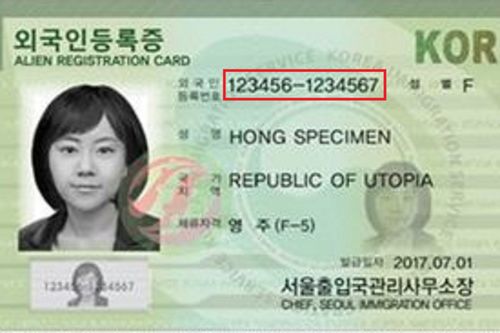 โดยชาวต่างชาติมีหมายเลขทะเบียนคนต่างด้าวแทนหมายเลขประชาชนและเกือบจะเหมือนของคนเกาหลี