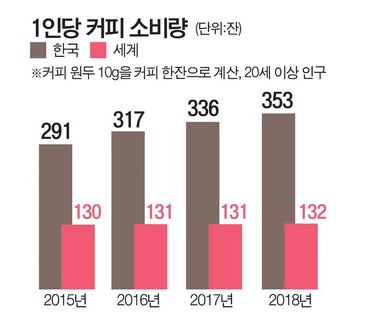 จากรายงานในปี 2018 ชาวเกาหลีที่มีอายุ 20 ปีขึ้นไปดื่มกาแฟเฉลี่ย 353 ถ้วยต่อปี คุณจะเห็นได้ว่าคนเกาหลีดื่มกาแฟอย่างน้อยหนึ่งแก้วต่อวัน