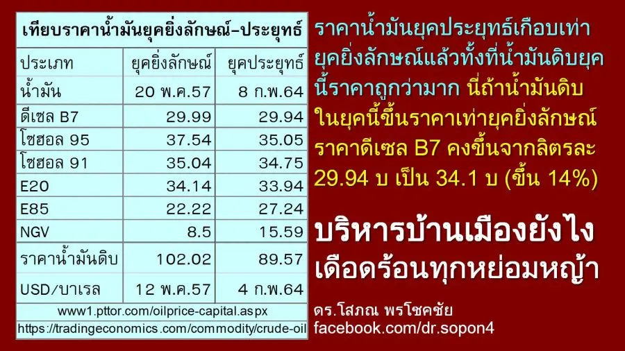2. ท่านควรนำข้อความที่ผมแปะในเฟสเองเมื่อวันที่ 12 กุมภาพันธ์ มาแสดง (https://bit.ly/3BmJZeI) ผมบอกว่า “ราคาน้ำมันยุคประยุทธ์เกือบเท่ายุคยิ่งลักษณ์แล้วทั้งที่น้ำมันดิบยุคนี้ราคาถูกว่ามาก นี่ถ้าน้ำมันดิบในยุคนี้ (89.57 เหรียญสหรัฐต่อบาเรล) ขึ้นราคาเท่ายุคยิ่งลักษณ์ (102.02 เหรียญสหรัฐต่อบาเรล) ราคาดีเซล B7 คงขึ้นจากลิตรละ 29.94 บ เป็น 34.1 บ (ขึ้น 14%). . .”
