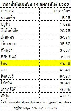 3. ข้อมูลราคาน้ำมันในบทความของท่านนำมาจากไหน โปรดแสดงแหล่งที่มาด้วยครับ เพราะที่ผมนำเสนอตามตารางท้ายนี้พร้อมอ้างอิงที่มา ราคาน้ำมันเบนซินของไทยแพงที่สุดในอาเซียน เป็นรองเฉพาะสิงคโปร์เท่านั้น แต่สิงคโปร์มีรายได้ประชาชาติต่อหัวสูงกว่าไทยถึง 8 เท่า (https://bit.ly/3BmC5lE) นี่จึงเท่ากับว่าราคาน้ำมันของไทยแพงกว่าสิงคโปร์เสียอีก ยิ่งกว่านั้นหากเทียบไต้หวัน ราคาน้ำมันของไทยกลับแพงกว่า และแม้เกาหลีและญี่ปุ่นจะมีราคาน้ำมันแพงกว่าไทยบ้าง แต่รายได้ของประชาชนของประเทศเหล่านี้สูงกว่าไทยหลายเท่า