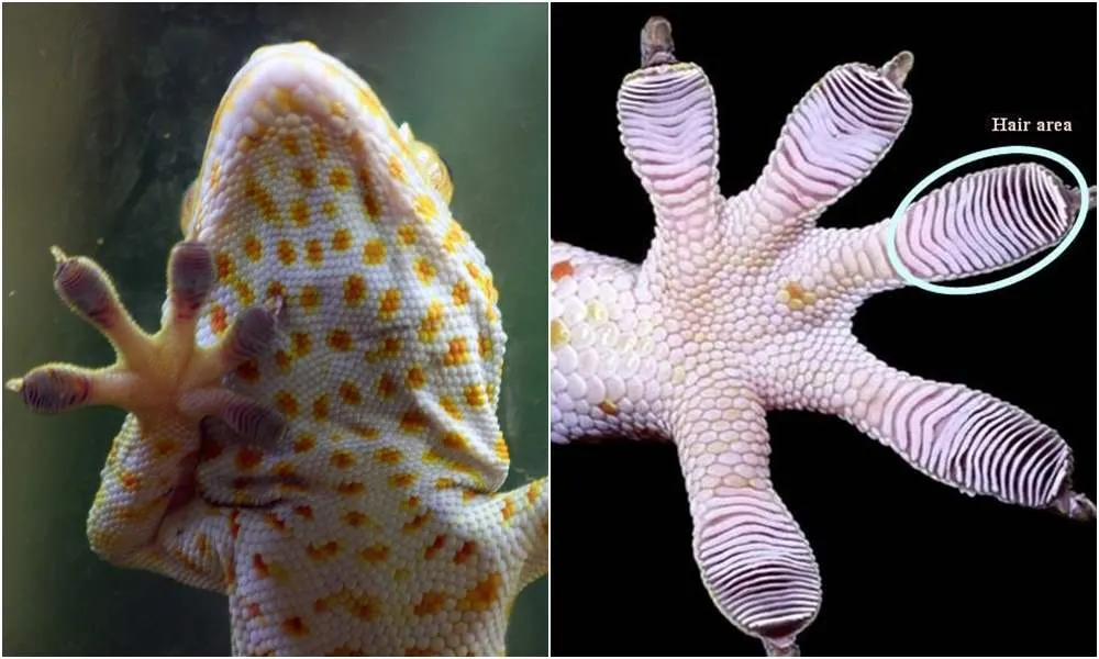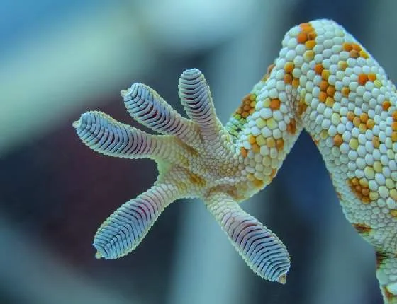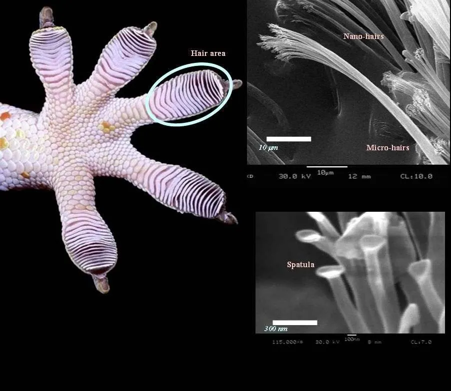 และนั่นทำให้เกิดการค้นพบบางสิ่งที่ทรงพลังอย่างเหลือเชื่อบริเวณใต้นิ้วเท้าของตุ๊กแก ซึ่งมีแผ่นหนังเรียงต่อกัน ที่มีเส้นขนจำนวนมากเรียกว่า spatulae และแต่ละเส้นยาวประมาณ 60-90 ไมครอน มีขนาดประมาณหนึ่งในสิบของเส้นผ่านศูนย์กลางของเส้นผมมนุษย์ ส่วนปลายของเส้นขนแตกแขนงและขยายออกเป็นตุ่ม เรียกว่า "เซต้า" ถูกนำมาใช้สำหรับยึดเกาะติดกับผนังได้โดย แรงวานเดอร์วาลส์ (Van der Waals force)