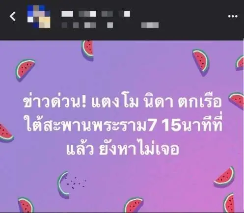 ด่วน! ช็อก! เป็นเรื่องที่ทำให้แฟนๆถึงกับตกใจกลางดึก เมื่อมีผู้ใช้เฟซบุ๊กรายหนึ่งได้ออกมาโพสต์ว่า “ข่าวด่วน แตงโมนิดา ตกเรือใต้สะพานพระราม 7 15 นาทีที่แล้ว ยังหาไม่เจอ “