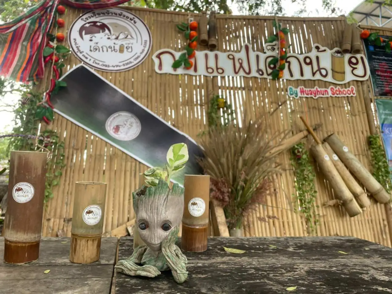 “น.ส.วาสิตา นุยจันทึก" ครูที่ปรึกษาโครงการ ร้านกาแฟเด็กน้อย กล่าวว่า กิจกรรม "ร้านกาแฟเด็กน้อย" เน้นส่งเสริมให้ผู้เรียนได้ฝึกทักษะอาชีพจากการลงมือปฏิบัติจริง ซึ่งปัจจุบัน การเปิดร้านกาแฟกำลังได้รับความนิยม และมีผู้ที่ชื่นชอบดื่มกาแฟจำนวนมาก มีการปลูกเมล็ดกาแฟพันธุ์ดีในประเทศ และในพื้นที่จังหวัดชัยภูมิ “สัมผัสรสชาติเมล็ดกาแฟเข้มข้น Arabica ผสมผสานกับ Robusta ที่มีกลิ่นหอมชวนดื่ม” เมื่อนำมาใส่ในแก้วไม้ไผ่ ก็ยิ่งทำให้มีรสชาติกลมกล่อมลงตัว ไม่เหมือนใคร ส่งเสริมทักษะการมีอาชีพให้กับนักเรียน สิ่งสำคัญเพื่อเป็นการส่งเสริมการสร้างรายได้ระหว่างการศึกษาอย่างยั่งยืนให้แก่นักเรียน โดยใช้เวลาในช่วงพักกลางวัน และหลังเลิกเรียนให้นักเรียนทำกิจกรรมที่เกิดประโยชน์ มีความสามัคคี ร่วมมือทำงานเป็นทีม เมื่อลูกค้าซื้อเครื่องดื่มที่ใส่แก้วกระบอกไม้ไผ่จากทางร้าน ถ่ายรูปเช็คอินลงเพจ “กาแฟเด็กน้อย By Huayhun School” จะได้รับส่วนลดทันทีแก้วละ 5 บาท มีความคิดริเริ่มสร้างสรรค์โปรโมชั่นที่ดึงดูดลูกค้า เพิ่มทักษะในการวางกลยุทธ์การขายสินค้า ทำให้นักเรียนได้เรียนรู้ฝึกการคำนวณงบประมาณต้นทุน-กำไร รายได้จากการขาย ฝึกให้นักเรียนมีจิตใจในการให้บริการ(Service mind) ยิ้มแย้มแจ่มใสมีมนุษยสัมพันธ์ที่ดี และกิจกรรมการเขียนเพ้นท์แก้วบนกระบอกไม่ไผ่เอกลักษณ์เฉพาะตัว มีการใช้แก้วไม้ไผ่ซึ่งเป็นวัสดุธรรมชาติโดยมีปลูกไว้ในชุมชน เพื่อเป็นการส่งเสริมรายได้ให้กับชาวบ้าน ส่งเสริมเศรษฐกิจชุมชน และช่วยลดขยะพลาสติกรักษาสิ่งแวดล้อมได้อีกด้วย