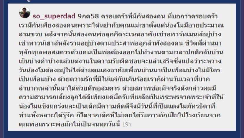 “..ครอบครัวเรามีกันเพียงสองคน เพราะได้หย่ากับคุณแม่เขาตั้งแต่น้องโมมีอายุประมาณสามขวบ หลังจากนั้น สองคนพ่อลูกก็ตระเวนอาศัยเช่าอพาร์ตเมนต์อยู่บ้างเช่าทาวน์เฮาส์หลังรามอยู่บ้างตามประสาพ่อลูกลำพังสองคน..”