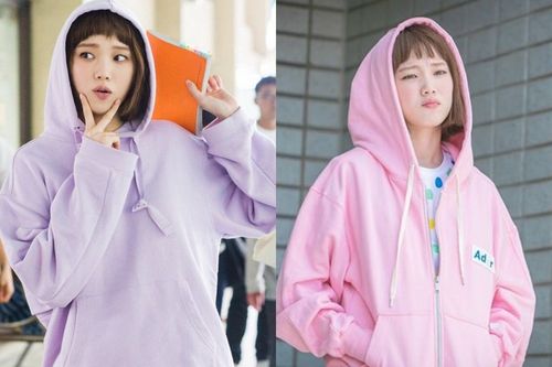 จะเห็นได้ว่าเสื้อฮู้ดของอีซองคยองในซีรีส์มักจะเป็นเสื้อฮู้ดธรรมดาและมีสีหวาน ๆ เช่น สีชมพูและสีม่วง ที่สำคัญเลยก็คือจะใส่ฮู้ดดี้กับกางเกงหรือกระโปรงไปเรียนก็ได้ทั้งนั้นเลยค่ะ!