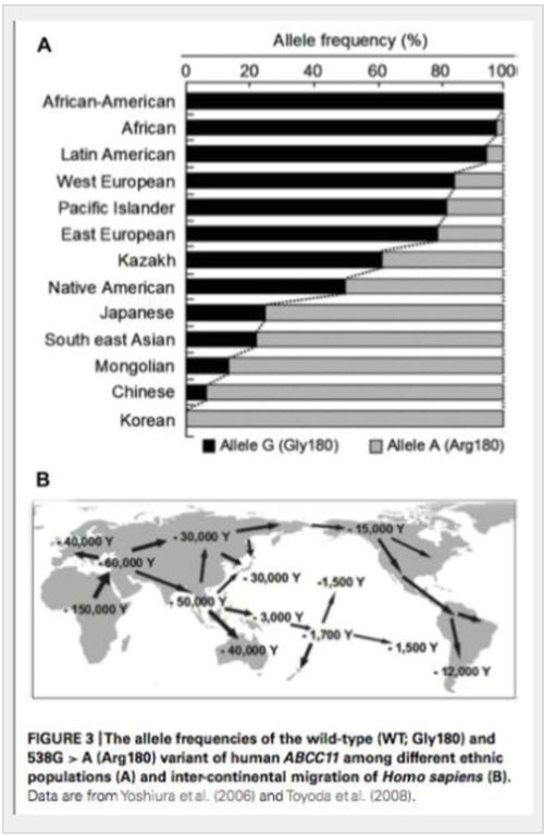 ทีมวิจัยจากมหาวิทยาลัย Bristol ประเทศอังกฤษพบว่ายีน ABCC11 ส่วนใหญ่จะพบในชาวยุโรปหรือชาวแอฟริกัน ในเกาหลีใต้มีเพียง 2% ของประชากรเท่านั้นที่มียีน ABCC11 อยู่ค่ะ ซึ่งก็ถือว่าเป็นสัดส่วนที่น้อยที่สุดในโลกเลยทีเดียว ลักษณะเฉพาะอย่างหนึ่งของยีน ABCC11 ก็คือจะมีขี้หูเปียกและมีกลิ่นตัวค่ะ อย่างไรก็ตามมีการกล่าวกันว่าชาวเกาหลี 5% ถึง 10% มีปัญหาเรื่องกลิ่นตัว แม้ว่าอิทธิพลทางพันธุกรรมจะมีมาก แต่ก็มีปัจจัยอื่น ๆ ที่มีผลทำให้เกิดกลิ่นตัวเช่นกันค่ะ