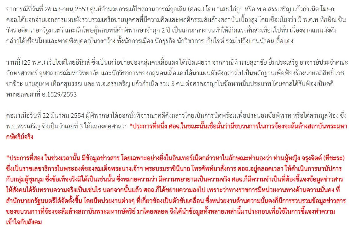 ปี 53 สื่อดังหลายสื่อ เผยเรื่องราวสุดอึ้ง เสธ.ไก่อู หวั่น “อภิสิทธิ์-สุเทพ” ลอยแพหลัง ปี 53 ศอฉ.แฉผังขบวนการล้มเจ้า ให้การต่อศาลคดีโดนฟ้องหมิ่น ระบุ แค่เป็นการให้ข้อมูลความเชื่อมโยง ไม่ได้บอกว่าใครล้มเจ้า ชี้ ประชาชน-สื่อ ที่เอาไปขยายความต้องรับผิดชอบเอง นักวิชาการแดงพอใจถอนฟ้องทั้ง 3 จำเลย
