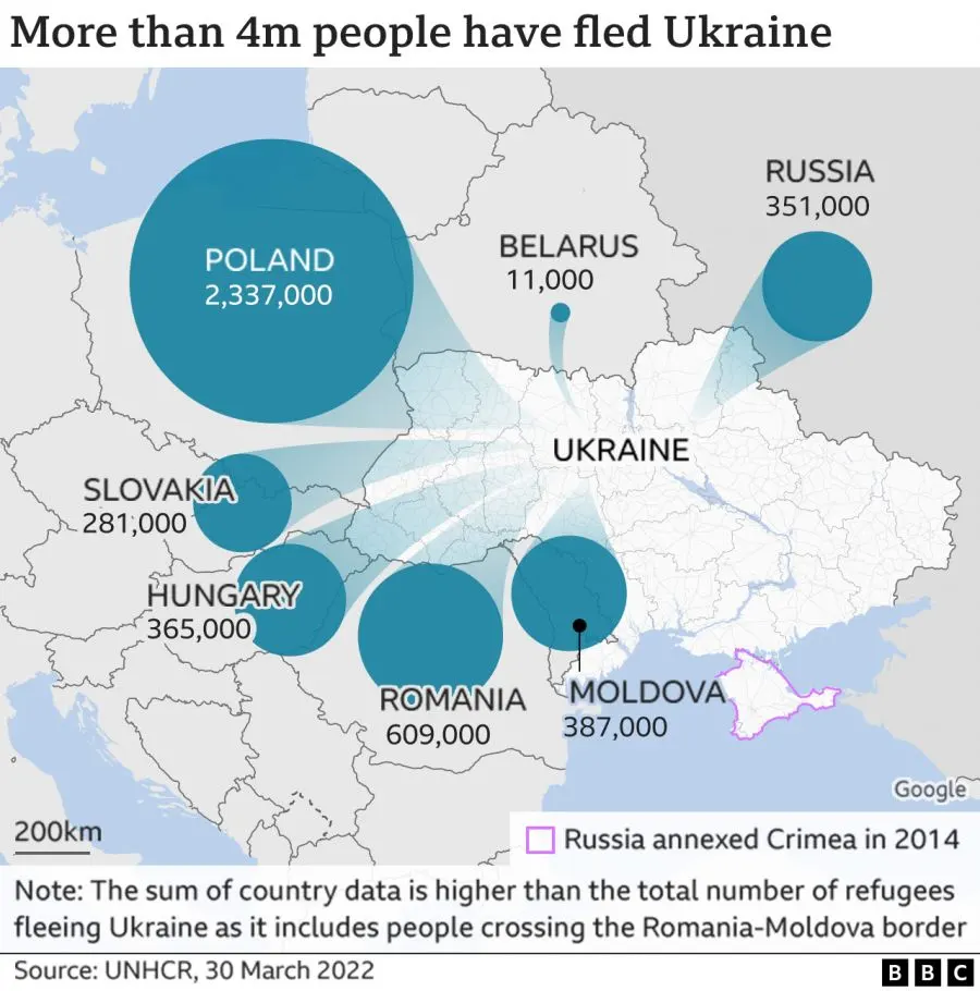 สหประชาชาติ กล่าวว่า ณ วันที่ 29 มีนาคมผู้คนสี่ล้านออกจากยูเครน: