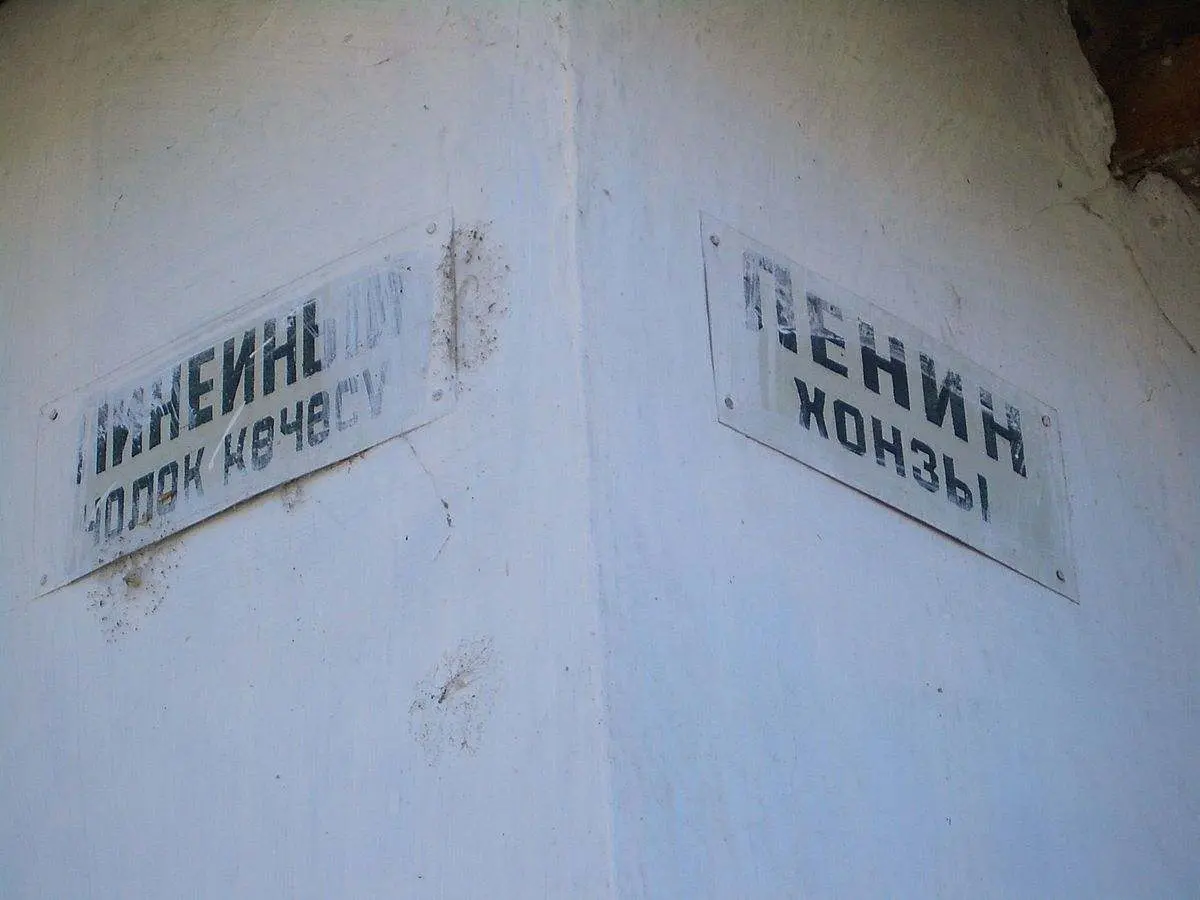 ป้ายมุมถนนในหมู่บ้านมิลยันฟัน ทางขวาเป็นภาษาดุงกาน ทางซ้ายเป็นภาษาคีร์กีซ ทั้งสองเขียนว่าถนนเลนิน