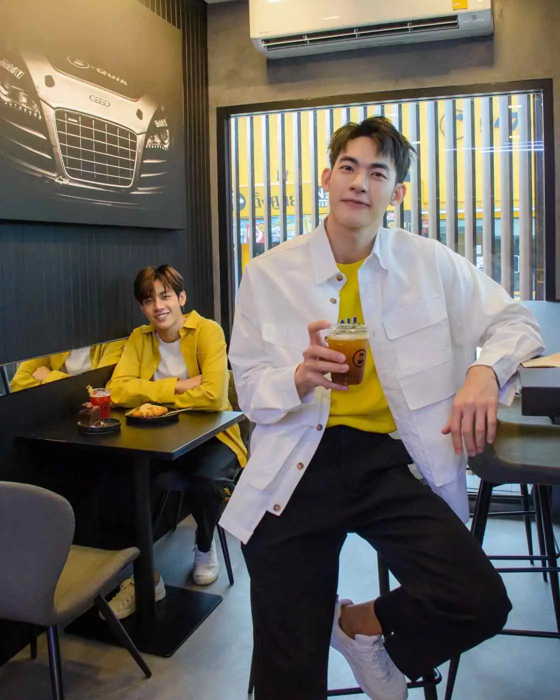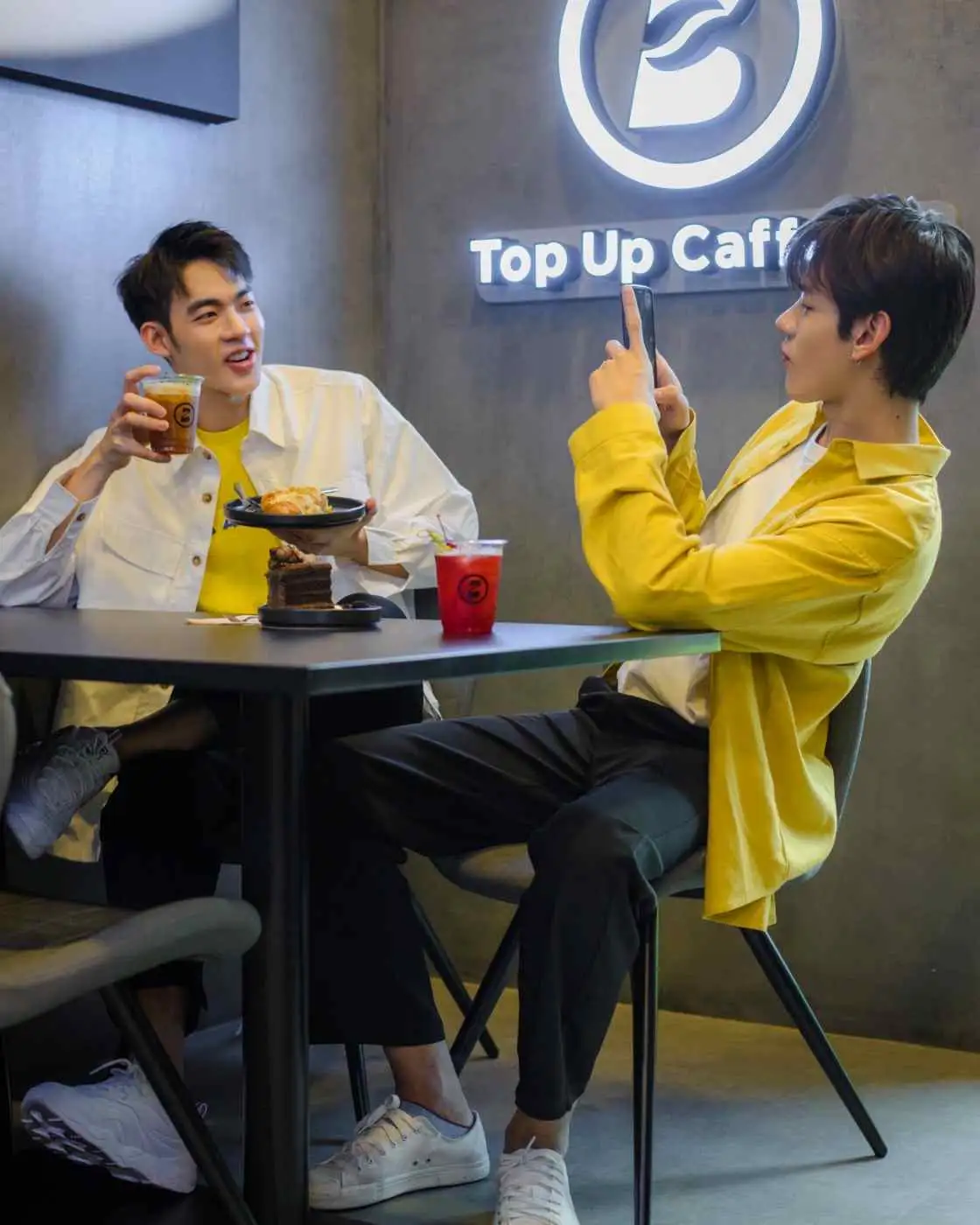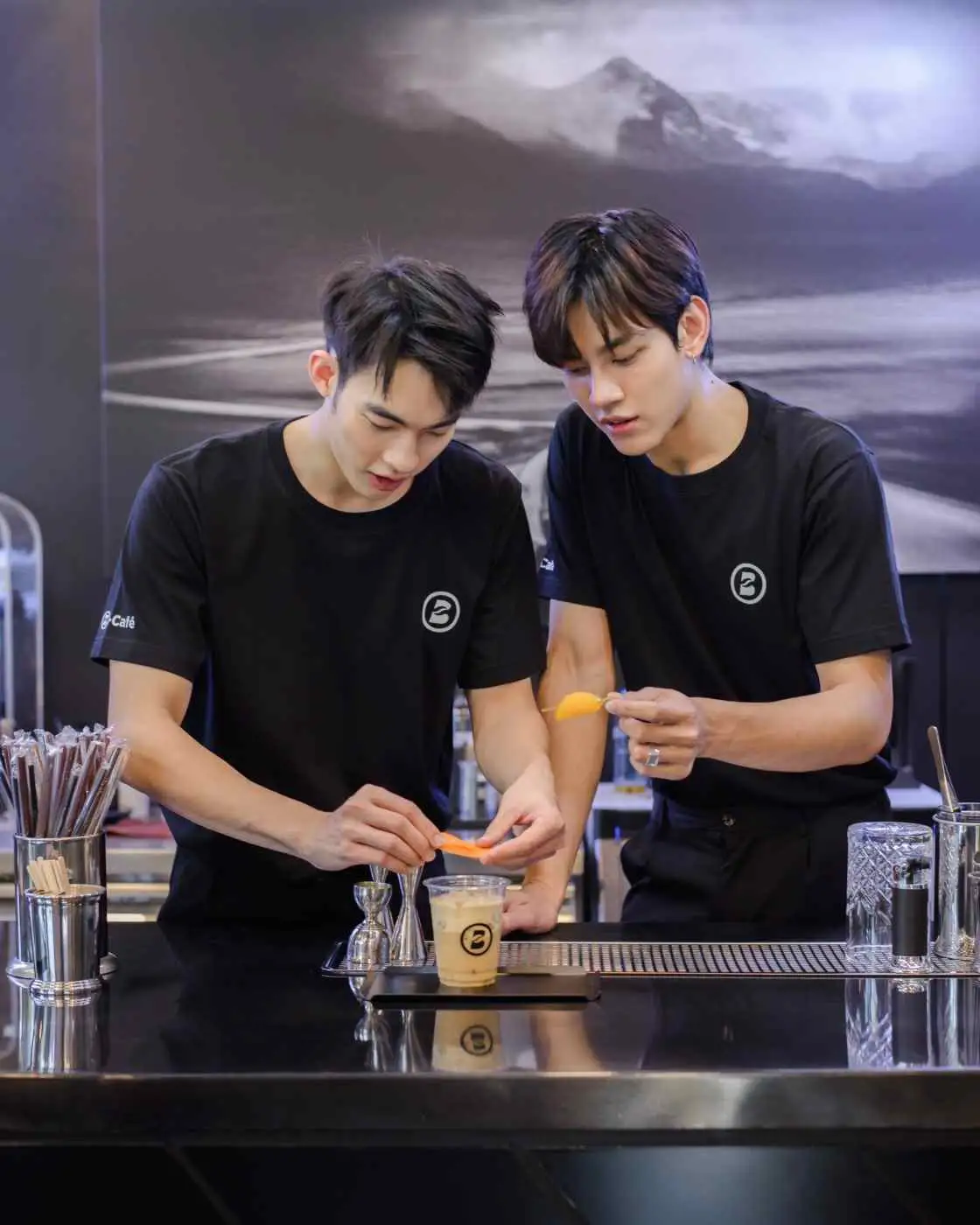 อากาศร้อนๆ แบบนี้ต้องแวะไปคาเฟ่น้องใหม่สุดคูลย่านนวมินทร์อย่าง "บี-คาเฟ่ (B-Cafe)" ที่เพิ่งจะเปิดใหม่เมื่อช่วงต้นเดือนเมษายน ในบรรยากาศ Racing Gallery โดยสองหนุ่มหล่อหน้าใส "แชป ศุภชีพ ชนะภัย" และ "กรีน พงศธร ผดุงเกียรติวงศ์" จากซีรีส์ดัง THE TUXEDO "สูทรักนักออกแบบ" ที่ตอนนี้ออกอากาศทางช่อง CH3 Plus ทุกวันเสาร์ เวลา 21.00 น. ได้แวะมาที่ บี-คาเฟ่ แล้วขอลองมาเป็นบาริสต้ามือใหม่ด้วยการชงเครื่องดื่มเมนู Signature ให้กับแฟนคลับในคอนเซปต์ "Top Up Caffeine" ซึ่งมีด้วยกันทั้งหมด 3 เมนู ที่น่าอร่อย และปลุกความสดชื่นให้กับทุกๆ คน