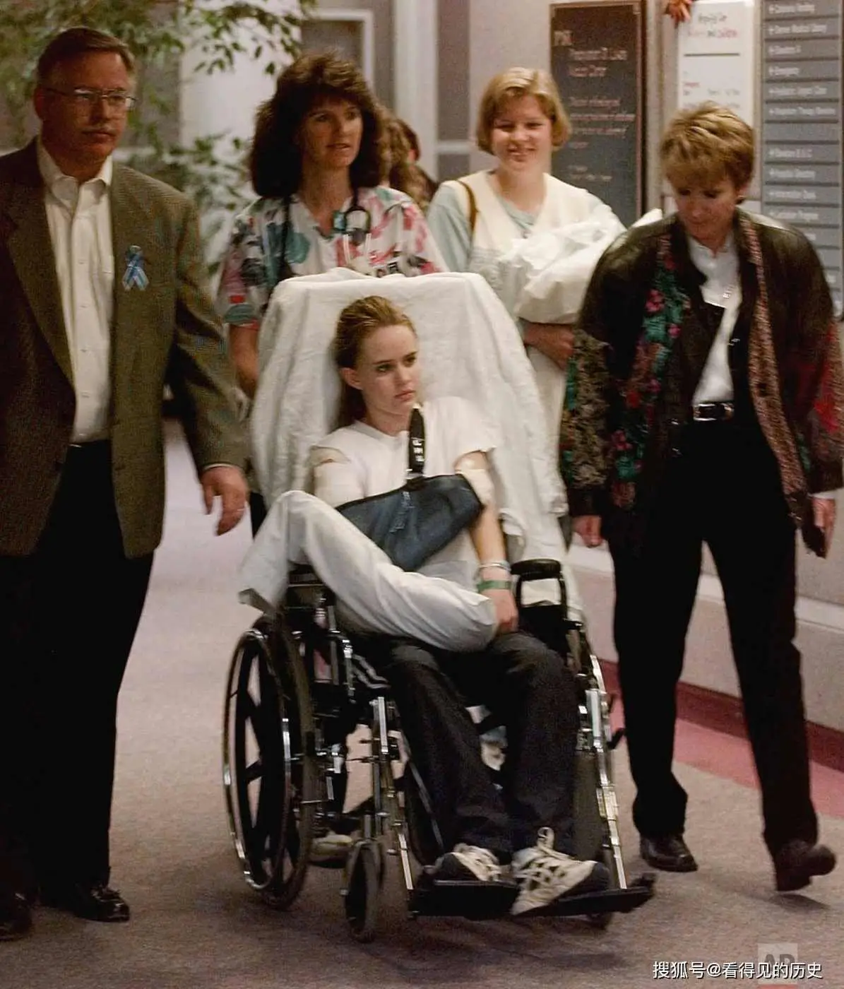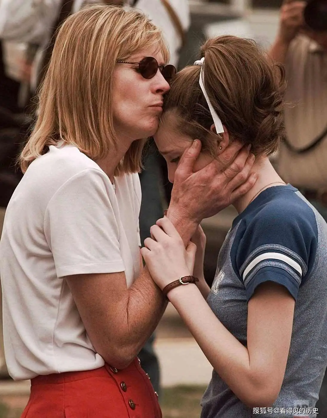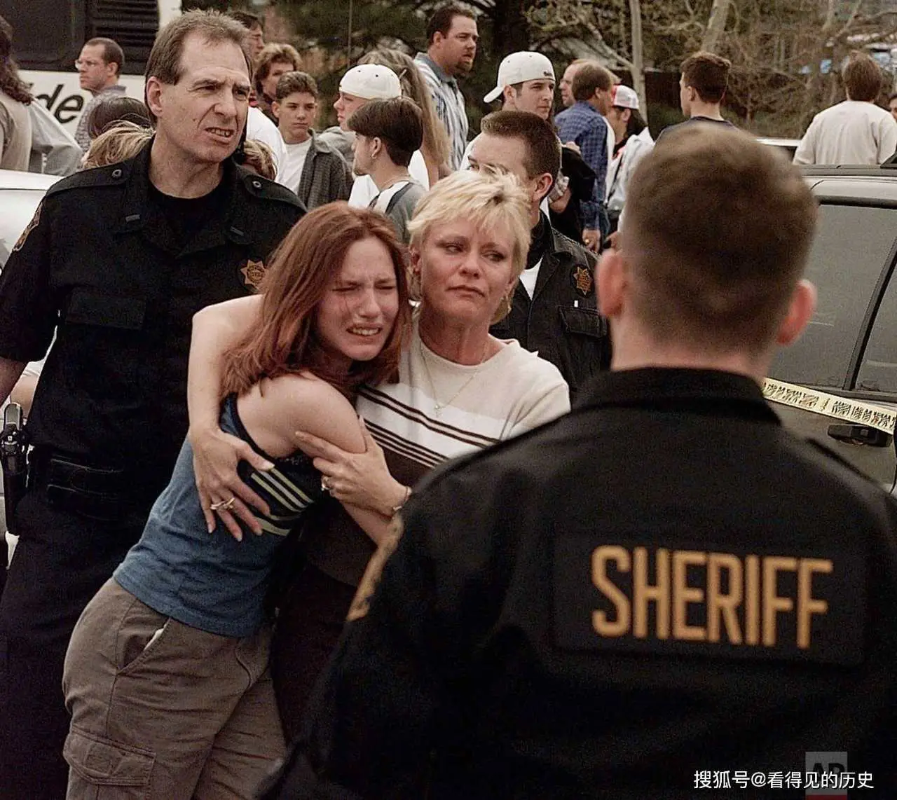 4. วันที่ 20 เมษายน 2542 หลังเกิดเหตุกราดยิงที่โรงเรียนมัธยมโคลัมไบน์ แม่กอดลูกสาวแน่น