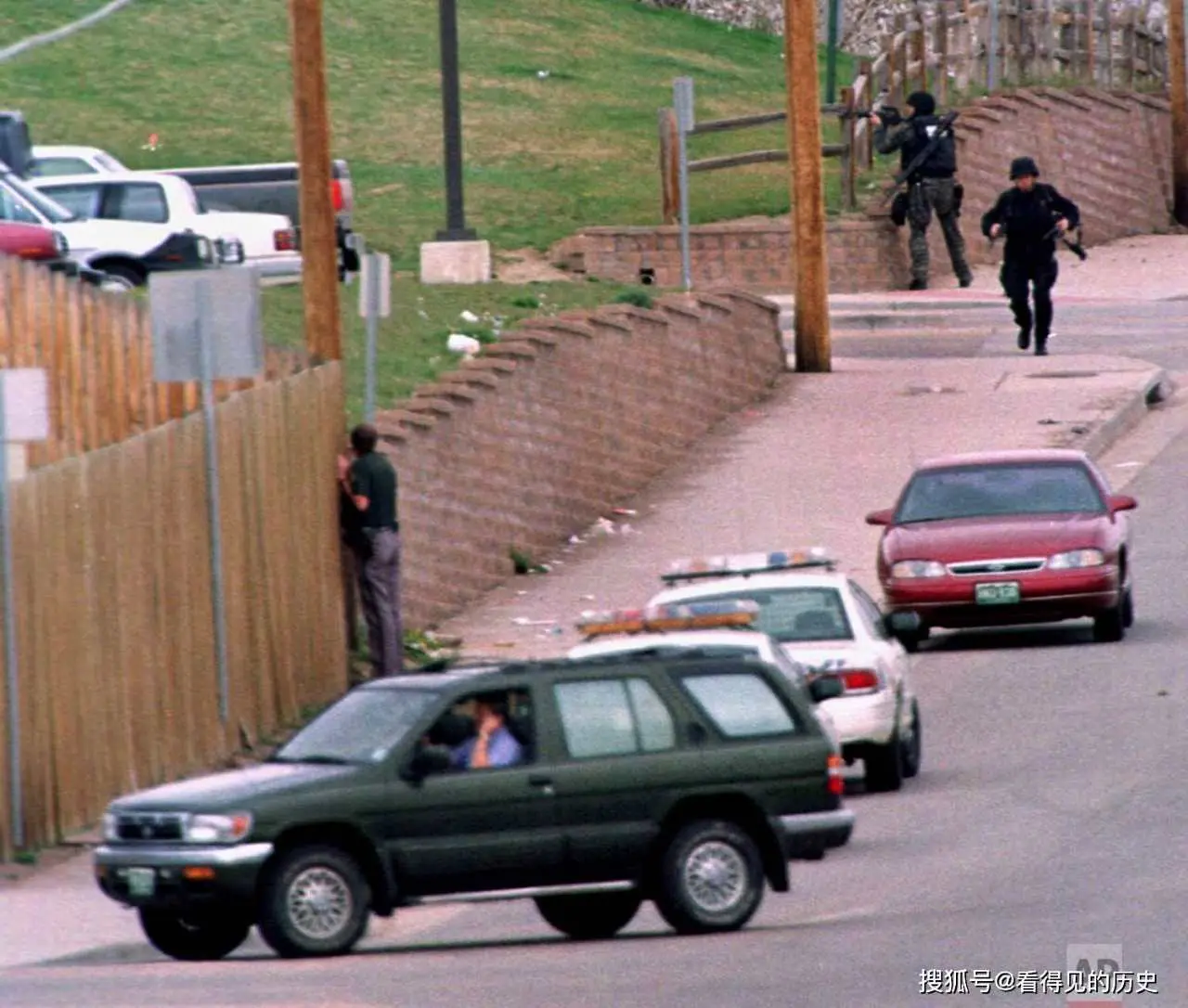 5. วันที่ 20 เมษายน 2542 มือปืน 2 รายถูกแทงหลังกราดยิงโรงเรียนมัธยมโคลัมไบน์ ทีม SWAT วิ่งลงที่ถนนเพียร์ซ และนายอำเภอคนหนึ่งในเจฟเฟอร์สันเคาน์ตี้ โคโลราโด เฝ้ามองโคลัมไบน์ไฮผ่านรั้ว